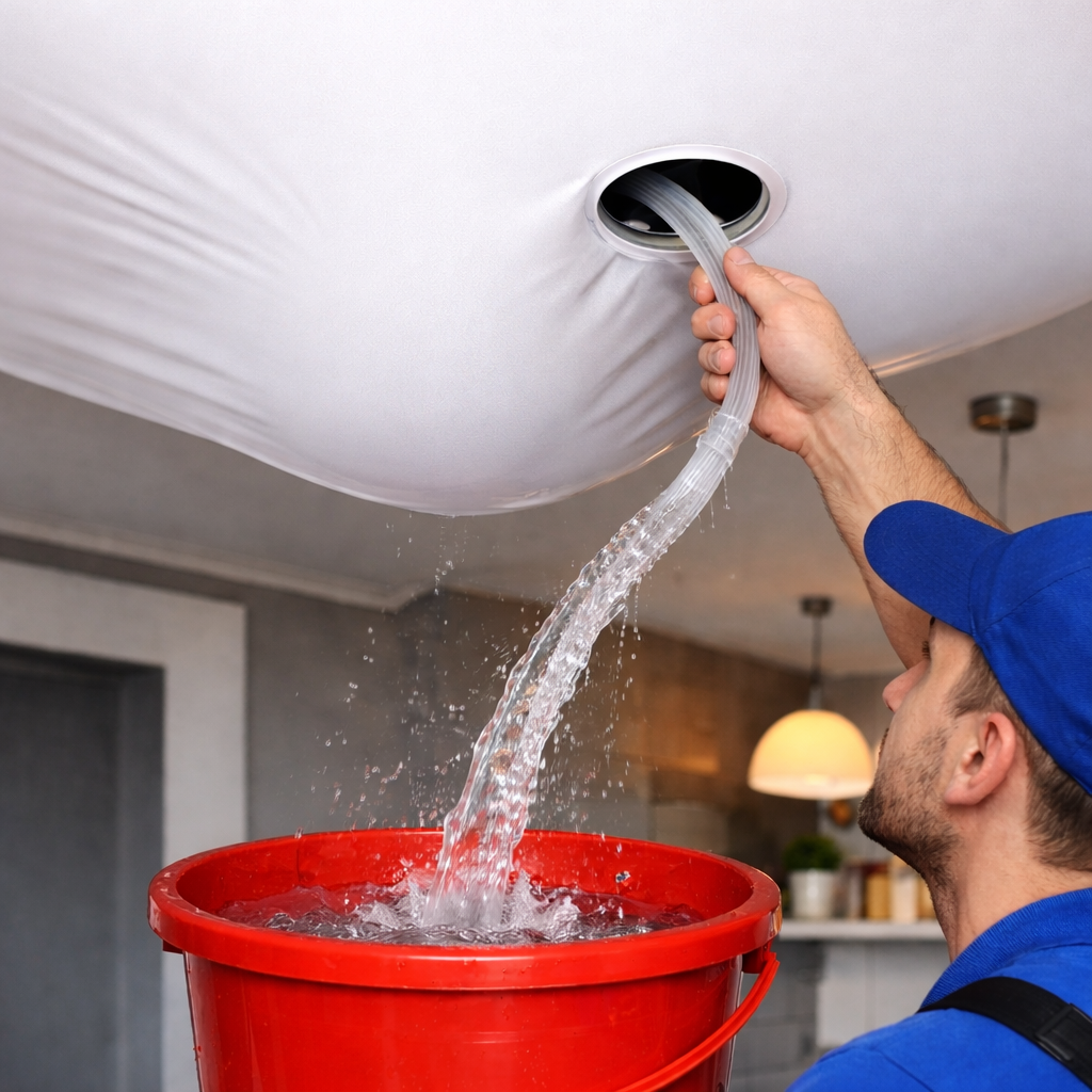 Аккуратный слив воды, восстановление потолка без замены.